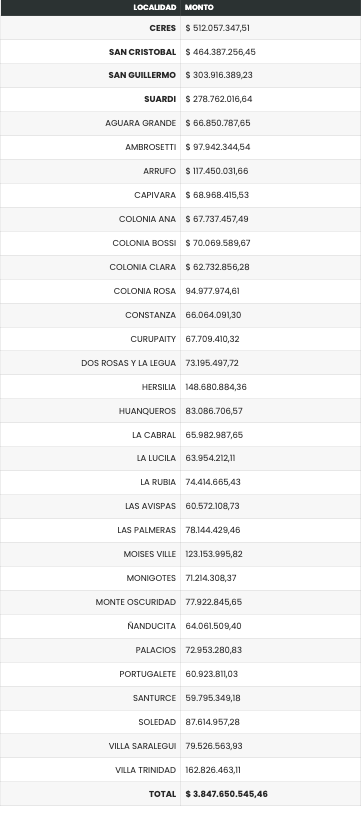 El Senador Provincial Felipe Michlig y el diputado Marcelo González informaron que de acuerdo a lo dispuesto por el Gobierno de la Provincia de Santa Fe que preside Maximiliano Pullaro se determinaron las partidas para el año 2026 (de acuerdo al presupuesto del año en curso aprobado en la legislatura) correspondiente al “Fondo para la Construcción de Obras y Adquisición de Equipamiento y Rodados para Municipios de Segunda Categoría y Comunas (Ley 12.385 y mod.)”, correspondiendo para las 32 localidades del Departamento San Cristóbal un total de $ $ 3.847.650.545,46 (ver gráfico por localidad).